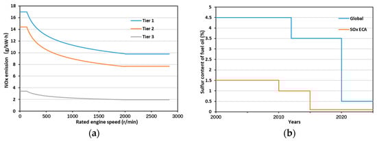 Ocean transportation undertakes more than 90% of the global freight transportation which has the advantages of low cost and high security [1]. Furthermore, ships generally use diesel engines as their main propulsion devices. Sometimes, high-sulfur oil is used as the alternative fuel in marine diesel engines for lower shipping costs. As a result, their exhaust emissions cause serious air pollutions [2,3,4]. To control the exhaust pollution of marine diesel engine, the International Maritime Organization (IMO) regulated the emission of NOX and SOX from marine diesel engine exhaust, as shown in Figure 1 [5,6].