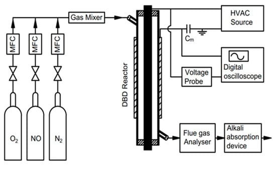 The schematic diagram of the experimental system is shown in Figure 2. The gas flow of each component is controlled by the mass flow controller (MFC) and mixed uniformly by the gas mixer before entering the DBD reactor. The exhaust gas after DBD treatment is absorbed by alkali liquor, which reduces the damage to the environment. The concentrations of NO, NO2 and O2 were measured by flue gas analyzer (Horiba PG-350). The total gas flow rate is 5 L/min and the gas temperature is 25 °C.