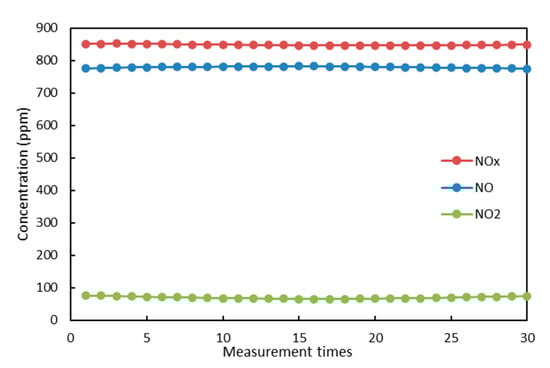 In each test, the concentration of NO, NO2 and NOX (NO+NO2) were measured by gas analyzer for 30 times, as shown in Figure 5. The standard deviations of NO, NO2 and NOX are 2.2, 3.3 and 1.8 ppm, respectively. The average concentrations of NO, NO2 and NOx were taken as the final test results.