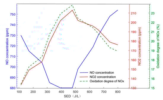 It is worth noticing that the oxidation degree of NOX rises first and then shows a decline trend with the increase of SED under oxygen-enriched condition, which is different from the NOX removal efficiency behavior under the condition of non-oxygen [19].