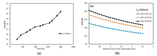 (a) The effect of SED on discharge voltage; and (b) the effect of SED on in gas gap of DBD reactor (electrode length is 50 mm and means peak-to-peak voltage).