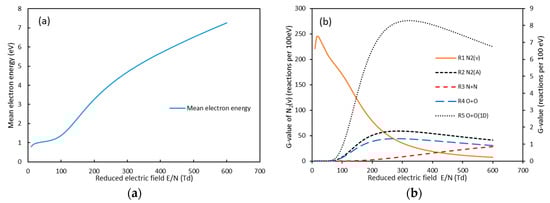 The simulation results are shown in Figure 9. Figure 9a shows the effect of E/N on mean electron energy. Obviously, the mean electron energy increases with the increase of E/N.