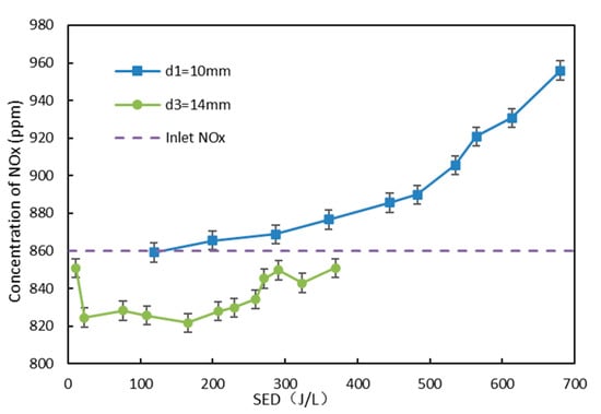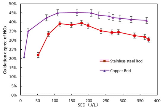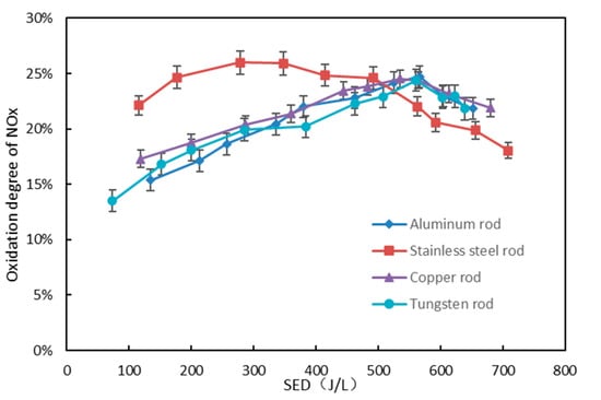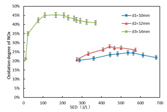 Figure 10 shows the effect of electrode diameter on NO oxidation under different SED conditions. The experimental results show that increasing the electrode diameter can obtain higher oxidation degree of NOX and reduce the energy consumption of DBD reactor. Increasing inner electrode diameter can reduce the gas gap of DBD reactor, which promotes the E/N of gas gap with the same supply voltage [16,19]. As E/N increases, the mean electron energy increases as well; thus, increasing the inner electrode diameter makes it easier for DBD reactor to generate O radicals and promote NO oxidation.
