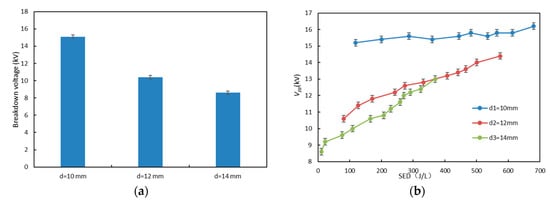 It can be seen from Equation (9) that increasing the diameter of the inner electrode can reduce the distance between the electrodes , thus the breakdown voltage is reduced, as shown in Figure 11a. Increasing inner electrode diameter reduces the gas gap of DBD reactor and makes gas discharge easier. Therefore, the DBD reactor with smaller gas gap has better discharge performance and higher oxidation efficiency under the same SED [38]. In addition, according to the theory of Townsend discharge, the discharge current increases exponentially with the increase of gas gap [39]: