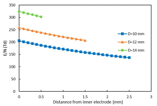 To analyze the mechanism, the distribution of E/N in the gas gap of DBD reactor with different inner electrode diameter was simulated, as shown in Figure 13. The simulation results show that E/N changes (∆E/N) in the gas gap of DBD reactors with 14-, 12- and 10-mm electrode diameter are 21.6, 51.8 and 68.5 Td, respectively. Increasing the electrode diameter does not simply improve the E/N, but also makes the distribution of E/N more centralized, which makes it easier for DBD reactor to operate at high O radical generation efficiency. It is difficult for the DBD reactor with 10-mm electrode diameter to inhibit the generation of and N radicals simultaneously due to the large ∆E/N in the gas gap. Therefore, the DBD reactor with 10-mm electrode diameter is easier to generation NOX and has a lower NO oxidation efficiency.
