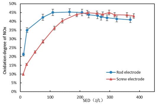 The effect of electrode shape on NO oxidation is shown in Figure 16. The results show that both the rod electrode and the screw electrode can make the oxidation degree of NOX reach 45%. However, the energy efficiency of the rod electrode is higher. The experimental result is different from the result of Wang and Talebizadeh under NO/N2 condition, as they showed screw electrode has a higher NO removal and energy efficiency [16,18,19].