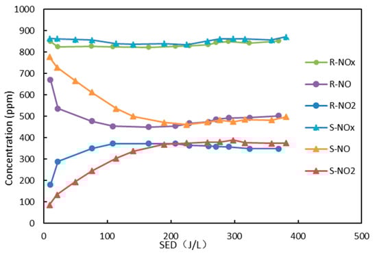 The discharge voltage increases with the increase of SED, as shown in Figure 8a. As a result, the reduced electric field strength E/N (ratio of the electric field strength to the gas particle number density) is increased (as shown in Figure 8b), which makes the mean electron energy increase [16]. Because the dissociation energy of N2 (9.8 eV) is higher than that of O2 (5.1 eV), the formation of O radicals is easier than that of N radicals in the process of plasma discharge [30]. O and O3 are generated firstly in the DBD reactor, which promote the oxidation of NO to NO2 via R4–R9 [26,27,28]. Therefore, the concentration of NO decreases, the concentration of NO2 increases and the oxidation degree of NOX increases gradually with the increase of SED at the initial discharge stage.