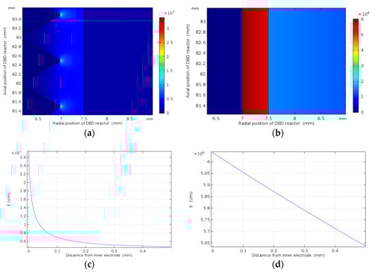 (a) Distribution of E in DBD reactor with screw electrode; (b) distribution of E in DBD reactor with rod electrode; (c) distribution of E in gas gap of DBD reactor with screw electrode; and (d) distribution of E in gas gap of DBD reactor with rod electrode. (Supply voltage is 5 kV, relative dielectric constant of the dielectric barrier is 3.7 and relative dielectric constant of the gas is 1.).