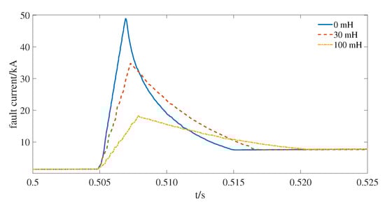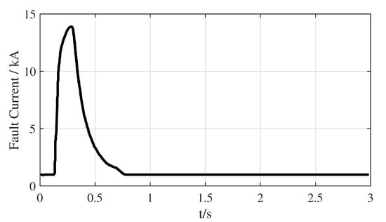 However, the application of MMC-based MTDC power grids brings several technical challenges. One major challenge is the massive DC short-circuit fault currents. When compared with traditional AC systems, the impedances of DC lines and MMCs are much smaller. Once DC short-circuit faults occur, the capacitors in the submodules of MMCs discharge immediately and large short circuit currents are fed to the fault point through the DC transmission lines and the power electronic devices []. A typical DC pole-to-pole short circuit of an MMC-based MTDC power grid is shown in Figure 1. It can be seen from Figure 1 that the short-circuit current rapidly rises within a few milliseconds with a peak value of more than after the DC short circuit fault occurs. DC current breakers are not commonly available for interrupting short-circuit currents due to the absence of a natural current zero crossing in DC systems, and they have very limited ratings for HVDC applications []. It is necessary to analyze and suppress the short-circuit current in order to ensure that the DC current breakers can isolate the fault line.