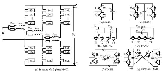 Different topologies of SMs for MMCs have been proposed and investigated, including the half-bridge (HB), the full-bridge (FB), the clamp-double (CD). and the three-level/five-level cross-connected (3LCC/5LCC) SMs [,,] as shown in Figure 2b–g. These SM topologies are available for the MMC structure that is shown in Figure 2a. The features of each topology are summarized, as follows: