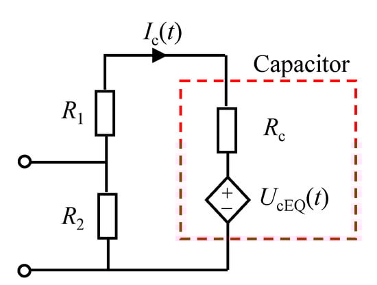 - DEM: based on the equivalent branch model of a bridge arm, a DEM of MMC is proposed in [,]. In the DEM, the dynamics of each SM capacitor is represented by an equivalent controlled voltage source in series with resistance []. The values of and arewhere C is the capacitance of each SM’s capacitor, is the time-step for simulation, and is the SM capacitor current. The DEM has three major assumptions: an off-state switch is equivalent to an open circuit; and on-state that is equivalent to ; is equal to the corresponding bridge arm current when the SM is inserted. is equal to 0, when the SM is passed by [].As a result of the aforementioned assumptions, each MMC arm can be modeled as a series connection of arm inductor , equivalent voltage source , and equivalent resistance . Figure 3 shows the equivalent circuit of each submodule of the MMC in DEM.