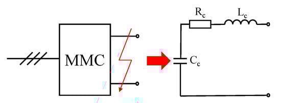 A short-circuit current calculation method that considers MMC control for MMC-based MTDC power grids is proposed in []. When compared with the previous calculation method in [,], the MMC is modeled as an RLC series circuit in parallel with a time-dependent controlled current source based on the AVM, as shown in Figure 9.