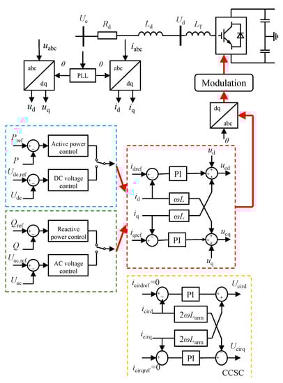 Figure 5 shows a typical structure of MMC control systems. The control systems for a single MMC consist of vector current controls (VCCs), phase-lock-loops (PLLs) and CCSCs [,,,,]. The VCCs consist of inner and outer control loops. The control modes of MMCs are determined by the outer loop control objectives that can be chosen among active/reactive power control mode, DC voltage/reactive power control mode, active power/AC voltage control mode, and DC/AC voltage control mode.