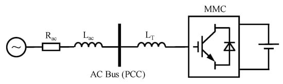 Figure 6 depicts the equivalent circuit of an AC system, where the AC system is modelled by a resistance-inductance series circuit with an AC voltage source [], and and are the equivalent AC resistance and inductance, respectively. are the transformer equivalent inductance. The internal dynamic characteristics of AC system are coupled with the DC power grid through the AC voltage source.