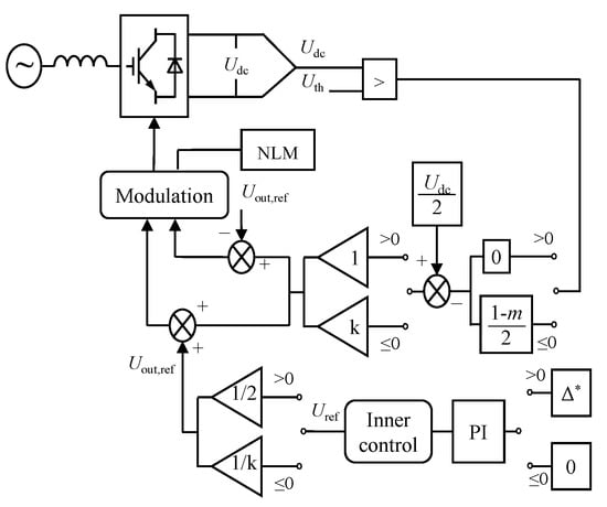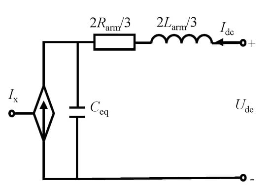 Figure 2a shows a general structure of a three-phase MMC. Each bridge arm of the MMC consists of an arm reactor and N series-connected sub-modules (SMs). is the equivalent resistance of the bridge arm. is the DC voltage of MMC. The multilevel output voltage is generated by controlling the number of inserted SMs in the bridge arm.