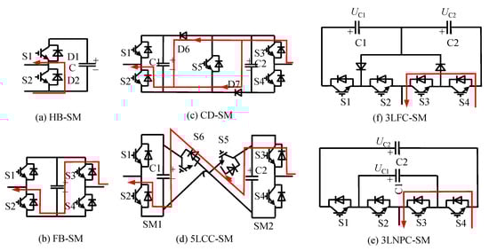 The HB-SM is the most widely applied topologies of MMC for DC power girds due to the simple structure and low cost. However, MMC rhat is based on HB-SM cannot block the fault currents fed from the AC grid [], as shown in Figure 10a. Without DC CBs, it can only clear DC fault line by tripping the AC circuit breakers []. Various SMs have been proposed and investigated in order to improve fault-blocking performance of the MMC-based MTDC power grids []. Figure 10b–e show the short circuit current discharge circuit (in red line) for various SM topologies.