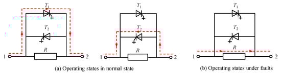 Figure 12. Operating states of resistive based solid-state fault current limiter (FCL).The resistive based solid-state FCL has two operational states. In the normal operating state, reverse parallel gate turns off thyristors (GTOS) in a conducting state, which ensures that the current-limiting resistor R is bypassed and the operational current can flow through the GTOs. Under DC fault conditions, and are turned off according to the operation signal issued by the fault detection system, and R is rapidly put into use, which increases the system damping and inhibits the fault current’s rising. - SFCL: the SFCL operates under a superconducting state in normal operation state, which offers no resistance to the load current. Meanwhile, it can achieve high resistance under fault conditions [,,,]. Figure 13 shows the short circuit current with resistive FCLs in a four-terminal MMC-based power grid, whose structure and parameters can be found in []. It can be found that, although the amplitude of the DC short circuit current can be effectively decreased, the resistive SFCL cannot limit the rising rate. To remedy this defect, reference [] proposes an improved structure for inductive SFCL, as shown in Figure 14.