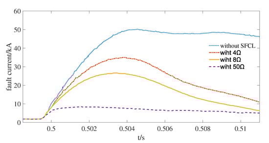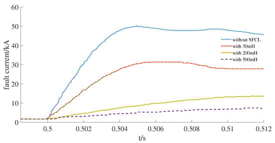 Figure 15. Short circuit current with the improved inductive SFCL. - NSFCL: a kind of structure of NSFCL, called capacitor-based FCL (CBFCL), is proposed in [] and the power circuit structure of the CBFCL is shown Figure 16.