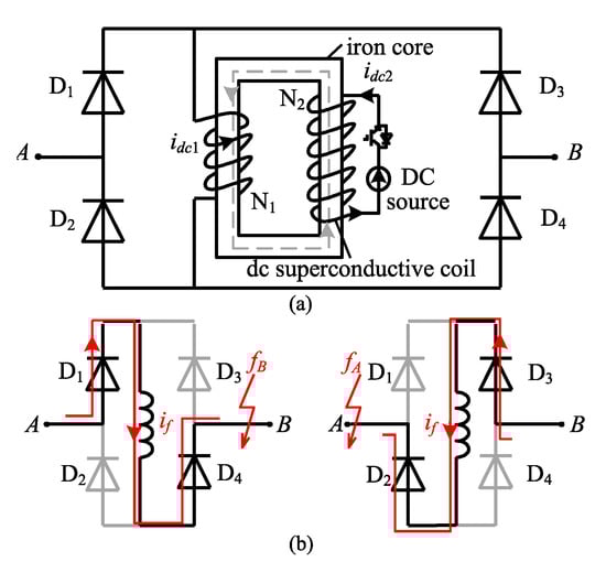 Figure 14. The working principle of the inductive SFCL: (a) Topology; (b) Short circuit current path.The inductive SFCL consists of several diodes and a saturated iron core SFCL. The saturated iron core SFCL is placed between the bridges composed with four diodes (). The proposed SFCL is connected in series in DC transmission lines via connectors A and B. Under normal conditions, the DC operational current can flow through the diodes groups and , or and . Wherever the short circuit fault occurs, the bi-directional SFCL allows for the fault current flow through. The copper made primary coils of the iron core SFCL are connected with the DC system. The secondary coils are made of superconductive materials and powered by a DC source. The external feature of the proposed inductive SFCL is equivalent to a small inductance and it has little impact on the system normal operational dynamics.The improved inductive SFCLs are applied to the four-terminal power grid that is shown in []. Under DC short circuit fault conditions, the inductance of the SFCL increases rapidly in order to restrain the rising rate of the short circuit current as shown in Figure 15. However, the permeability and the coil turns limit the size of the proposed inductive SFCL []. Moreover, superconductive FCL needs a high technological level and huge capital cost [], which makes it unable to be widely applied in MMC-based MTDC power grids.