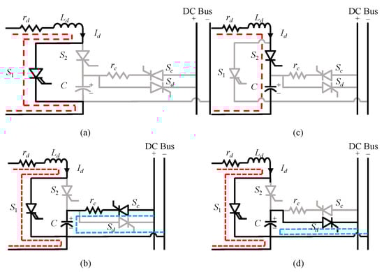 Switch is applied to flow the normal operation current, while is applied to flow the fault current. Energy is transfered between the capacitor bank section and the DC bus through and . The operation modes that are under normal conditions are shown in Figure 16a,b and operation modes under fault conditions are shown in Figure 16c,d. Under normal conditions, is turened off and the capacitor bank section is charged while taking into account resistor in series with capacitor bank after a time constant. Because the capacitor bank section receives electrical energy from the DC bus, which leads to a voltage rise. is conducted after the voltage of capacitor bank section reached a determined level. The proposed CBFCL circuit has little impact on the normal operation of the MMC-HVDC system. When a DC short circuit fault occurs, is conducted. By turning on in short circuit current limitation, it makes the capacitor bank section and inductor participate insert in current path.