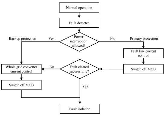 A source-side DC fault current clearance scheme for hybrid MMC-based power grids is proposed in []. The hybrid MMC consists of the HB-SMs and FB-SMs and it adopts converter DC current control and DC fault line current control during the fault. Figure 17 shows the flowchart of the protection scheme. After the DC short circuit fault is detected, the nearest MMC switches into fault line current control mode and the fault is isolated by a mechanical circuit breaker. In the proposed scheme, there are no DC CBs required, which significantly benefits the construction of MMC-based DC power grids. However, the above two methods need hybrid MMC and it is still not available for the most widely applied HB-MMC.