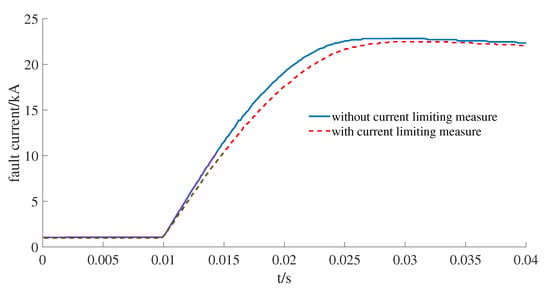Figure 18 shows the fault current limiting control strategy structure. Under normal operation conditions, the output voltage of the system is larger than the voltage. The DC component compensation of the bridge arm voltage is 0, and the AC component in the bridge arm is not adjusted. Therefore, it has litle impact on the normal operation control characteristics of the system. Under DC fault conditions, the system output voltage rapidly drops once the short circuit fault occurs, which will be smaller than the voltage threshold. The control system switches the operation mode to compensate the DC component of the bridge arm voltage. With the DC and AC component of the compensated bridge arm reduced simultaneously, the output DC voltage is further reduced and the fault current is suppressed. The proposed current limiting measure is applied to a double-terminal MMC-HVDC system in []. Figure 19 shows the comparison of DC short circuit current with/without a current limiting measure. The increasing rate of the DC short-circuit current with a current limiting measure significantly decreases.