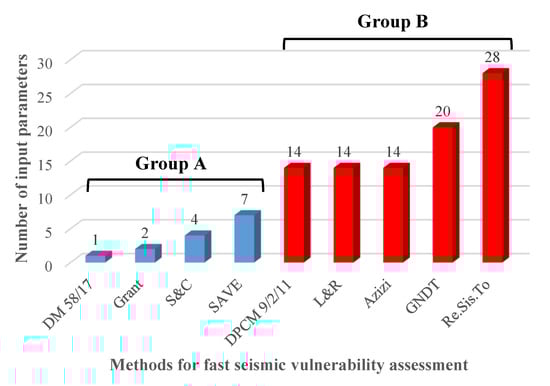 Figure 1 shows a direct comparison among the nine methods selected for this study. In particular, the number of input parameters required by the different methods was compared. It should be noted that the number of parameters counted for the procedures of Group B also includes the detailed parameters for the seismic shear resistance and demand of masonry buildings (