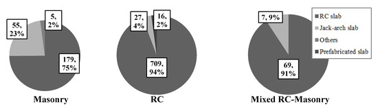 For masonry buildings, the following further parameters are considered: roof typology (inclined or plan), roof lightness, the presence of isolated columns, and the presence of ties. For RC buildings, also the regularity of infill walls is taken into account. For ‘mixed’ buildings, the type of mixed structure and the roof typology are considered as additional parameters.