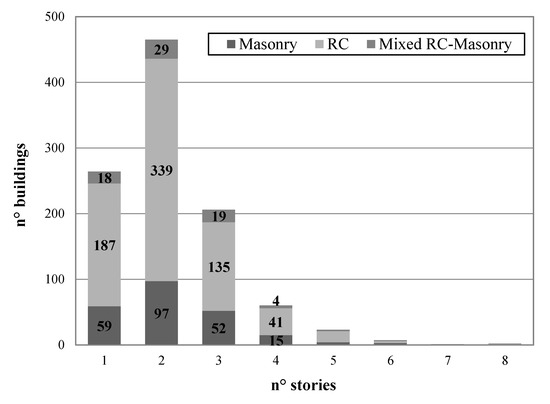 Based on the information gathered by the forms available in the digital platform, it was evidenced that all the examined masonry buildings were made of tuff stones with regular texture and floors were mainly made of RC elements and light bricks, while in a few cases were made of steel profiles and light bricks. The height of buildings was variable from 4.0 to 9.0 m; in particular, nine buildings had 1 or 2 floors, three buildings had 3 floors, and two buildings had 4 floors. The wall geometry was gathered by the digital platform too, in particular the areas of the resistant walls in the two directions were detected due to technical drawing of each floor available for these buildings. About the construction period, seven buildings were realized before 1960, four buildings between 1960 and 1975, and three buildings were built before 1945.