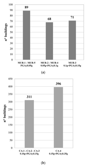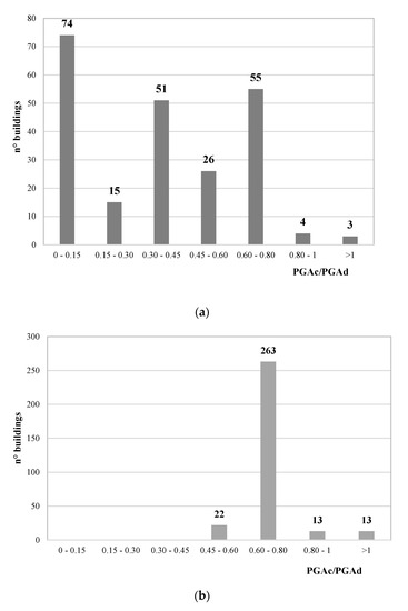 For all methods, the design seismic action, PGAd, was again expressed by the design PGA for the return period of 475 years and subsoil type B. In particular, for the 14 examined buildings, the PGAd varied in the range 0.18–0.21 g (i.e., corresponding to 0.15–0.18 g on rock).