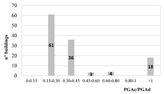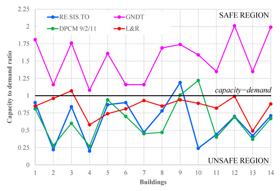 Figure 12 show that the GNDT method was the less safe approach since for all examined buildings the safety factor was largely > 1. This is probably due to an overestimation of the PGA capacity that depends both on the correlation given by Equation (3) and on the judgments assigned in the relief form, which were strongly affected by the subjectivity of the compiler or by a lack of information.