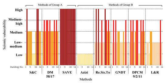 Note that the methods Azizi, RE.SIS.TO, and GNDT of Group B allow one to express both a quantitative and a qualitative, i.e., linguistic, judgment (from ‘low’ to ‘high’) about the level of vulnerability of the buildings. Thus, in