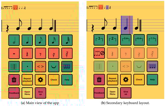 The user interface of the rhythmic application follows the conventional steps in practice. The students listen to a rhythmic sequence, which they have to write down in music notation. Therefore, the main part of the rhythmic dictation application’s user interface (Figure 1a) includes two staves displaying the input rhythmic sequence and a rhythm input interface. The upper (smaller) stave shows the entire sequence with a red rectangle indicating the area shown in the lower larger stave, where the user inputs their response to the dictation. The dictation can be repeatedly played-back and paused while playing.