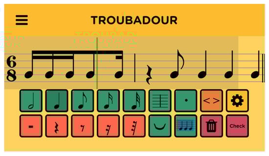 A number of different problems have been researched in signal processing and music information retrieval (MIR) communities. Some topics, such as music transcription (e.g., [1,2,3]), artist similarity, and recognition (e.g., [4,5]), have been dealing with information retrieval and classification, while others—including the automatic accompaniment (e.g., [6]), music theory learning, and automatic generation and evaluation of music exercises (e.g., [7,8])—have been focused on aiding the learning process of performers, writers, and music creators. In general, the music theory learning process requires talent, patience, and a significant amount of time to practice. Consequently, music theory learning and ear training are unpopular, especially among children and students. To aid the learning process, gamification of learning has taken a significant step towards easing the traditional methods of learning [9,10]. With gamification, the user perceives the task at hand as less serious and its completion more gratifying. The goal of a gamified system is to give the user well-balanced tasks and reward them by positive reinforcement elements in order to gain and retain user’s engagement. It could also be argued that modern gamification techniques are rather digitized than invented [11]. Coming from the evolving field of computer game production, gamification was re-discovered through “serious” games and game-based learning as digital techniques for user engagement [12]. Consequently, much work has been invested in researching the underlying processes for students’ engagement [13] and several products for e-learning have been introduced—from learning management systems, such as Moodle (https://moodle.org), to specialised platforms and apps [14].