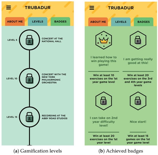 In order to increase the students’ motivation to use the application, we have enriched it with the basic elements of gamification. We use three gamified elements that relate to the students’ performance: a user profile and avatar creation, achievement badges, progression levels, and a leaderboard. The progression levels (Figure 4a) and achievement badges (Figure 4b) are visible on the student’s home screen. Students increase their level of proficiency by solving more exercises and progressing through levels of difficulty. The levels were defined by the teachers, and they vary from local orchestra to different competitions and international institutions. The badges, as shown in Figure 4b, reflect three different aspects of the student’s progress. The first aspect is accuracy: completing an exercise with(out) a certain amount of mistakes (from 50% up to 100% correct answers). The second aspect is the continuity of the student’s engagement with the platform: playing an exercise for a certain amount of days in a row—three days, five days, a week, two weeks, a month. The third aspect is the student’s speed: the amount of time needed to complete an exercise in five minute intervals, ranging from 25 min to five minutes.