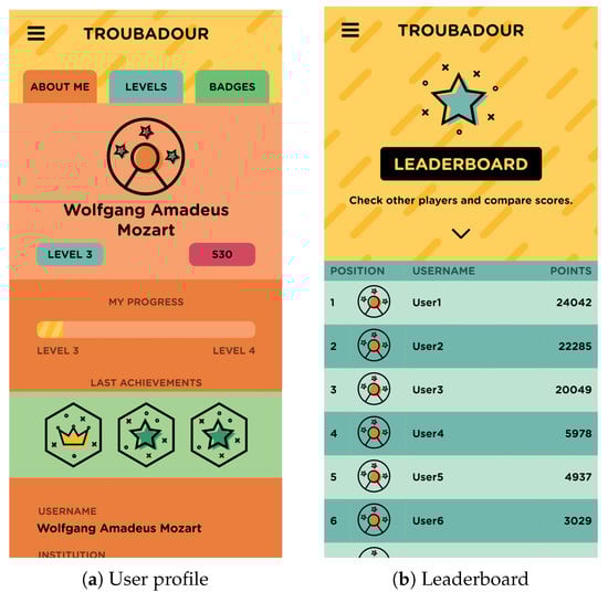 In their profile, the students can also set or change their profile picture, username, institution, and school year (Figure 5a), with a visual representation of the collected points and achieved levels, and observe the leaderboard (Figure 5b). The leaderboard shows the cumulative points that were collected by individual players throughout their application use. More points can be achieved by both increasing the number of solved exercises and increasing the exercises’ difficulty. The students can observe their performance and compare it to the other players. By clicking on one of the platform’s users, the selected user’s profile page is displayed, with their achieved levels and badges.