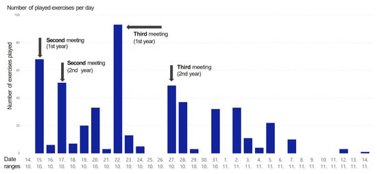 Graph of the application’s usage frequency per day. The second and third meetings are marked individually for each test group. The engagement the day after the meeting (# of exercises) was initially low after the meeting with both the first- and the second-year students. However, it increased after the second meeting.