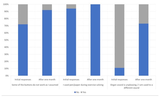 Initial responses to individual questions about the students’ behaviour and experience while using the application, and the responses after one month of application’s use. The most significant change is in the students’ perception of the organ sound. No student reported still using pen/paper while using the rhythmic application.