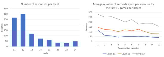 The number of responses (sequences solved) per levels (left), and the average number of seconds spent per exercise in first ten consecutive exercises for first three levels.