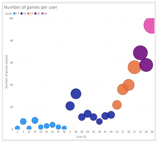 The frequency of application’s use, sorted by the final achieved level of individual user. The circle color represents individual levels (11, 12, 13, 22, and 24), while its size shows the number of games played by the individual user.