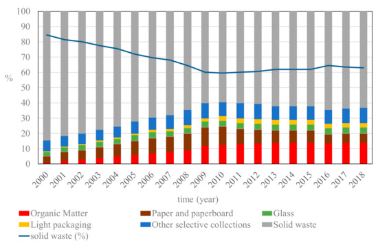 In the specific case of Spain (including Andorra), 11 waste-to-energy plants operated in 2019, treating approximately 2.5 Mt of MSW [3]. Specifically, in Catalonia (Northeast Spain), the separate collection of recyclables materials and bio-waste was introduced in 2000. It was expected they could recycle around 50% of the MSW by 2020. Nevertheless, the data in Figure 1 show that targets were not achieved, and the recycling rate was less than 40% [4]. This recycling rate is still very low, despite the efforts made by the public administration.