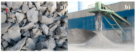 In order to prepare 50 m3 of GM, after 28 days of curing, the hardened M was crushed (Figure 2a) to obtain an aggregate with a particle size lower than 30 mm. The WBA (ρ = 1.73 kg·cm−3) was also prepared (Figure 2b). Afterwards, M (ρ = 1.85 kg·cm−3) and WBA were stored in stockpiles (Figure 3a). Finally, WBA was mixed to create the GM [1,27], as shown in Figure 3b. Around 18.5 t of crushed M and 69.2 t of WBA were taken for the formulation of GM.