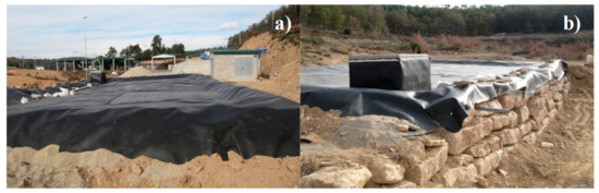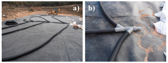 The real experimental section with the GM developed in this study was implemented, simulating a road subbase layer in Clariana de Cardener (Lleida, Catalonia, Spain). To this end, over a high-density polyethylene (HDPE) geomembrane, different 1.5 mm thick pipes distributed as fish spines were placed to collect the leachates after raining, as Figure 4 shows. On the top of the pipes, a draining natural gravel cover was put in order to avoid the obstruction of the pipes produced by the fine particles of the GM. Regarding the experimental scenario, the total surface of the experimental section with GM was 200 m2 (10 m × 20 m), and it was 0.2 m thick. In addition, a 10 cm thick natural gravel cover was also put over the GM layer to avoid the materials’ losses due to adverse weather conditions in the area.