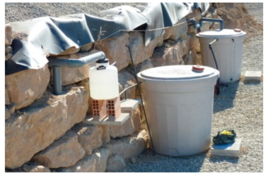 The rainfall area was considered to properly interpret the results obtained. The rainwater samples were collected on the first not-rainy day after one (or some) rainy day(s) with the help of two different pluviometers. From the total extension of 200 m2, 199 m2 were intended for the rainwater leachates’ evaluation. The leachates must pass through the 0.2 m of the surface’s thickness. This area was called “punctual” Figure 5a). A 1000 L “punctual” tank collected the percolated rainwater samples. The “punctual” leachates were collected each time it rained, and afterwards the “punctual” 1000 L tank was emptied. On the other hand, a 1 m2 area was called “accumulated”, and we evaluated the leaching behavior of that specific surface (Figure 5b). The tank for the “accumulated” leachates was not emptied in any case. The collection of the “accumulated” percolated rainwater was made through two connected volume-measured deposits, one of 30 L in order to be more precise when collecting the first leachates, and one of 1000 L to collect the “accumulated” leachates of the 1 m2 area (Figure 6). Therefore, both kinds of leachates were analyzed each time it rained for almost two years. The L/S ratio value in the experimental section at the end of the study was 2, considering both “accumulated” and “punctual” leachates.
