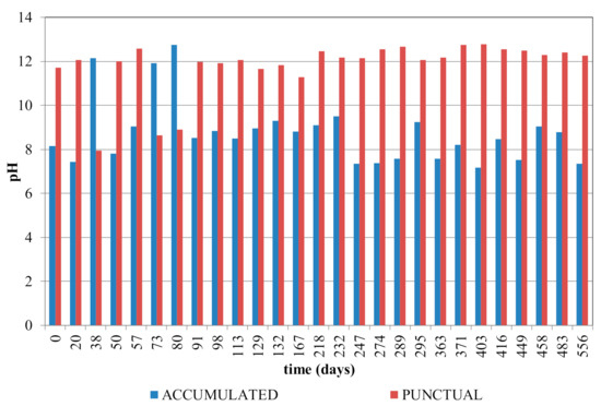 Figure 7 shows the pH results from the “accumulated” and “punctual” rainwater leachates. As the figure shows, in general, the pH in the “punctual” leachates is higher than in the “accumulated” ones, due to the saturation of the solution because of the high lime (CaO) content. The pH in the “accumulated” leachates is close to the pH controlled by the Ca(OH)2. Besides, although both types of leachates have the same L/S ratio (a value of 2), the “punctual” pH is higher because, as the surface is higher, the ability to collect rainwater is also higher. Therefore, as the “accumulated” area receives more leaching rainwater, it may not have achieved the saturation, or the lime concentration in this surface is lower. It would also be important to consider the evaporation phenomenon as another parameter to consider in the L/S ratio (it is not contemplated in this study). Regarding the “accumulated” ones, the pH values were between 7 and 9, although two samples at the beginning of the experimental section were pH > 12. The pH of “punctual” samples was more constant, and in general, more alkali (around pH = 12), compared to the “accumulated” leachates. This behavior is usual for the M sample, as it is controlled by the CaO solubility of both the APC and OPC binder at a pH around 12. This pH factor is important to consider regarding the release of some metal(loid)s, because some of them are pH-dependent (such as As (III), Cr (III), Cu, Ni, Pb and Zn).