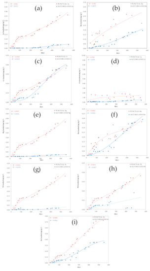 As previously mentioned, the rainwater leachates were collected each time it rained in the area of the experimental section. The collection of the leachates was done on the first not-rainy day. This means that if, for example, on three consecutive days it rained, the leachates were assembled on the fourth day. The rainwater samples were assembled 27 times, after almost 600 days. The following results (Figure 7 and Figure 8a–i) compare the “accumulate” and the “punctual” leachates, expressing the “punctual” as an addition of the concentration of each previous metal(loid) concentration analyzed. This means the “punctual” leachates are expressed as an integration of each previous concentration result, in order to compare them with the “accumulated” results.