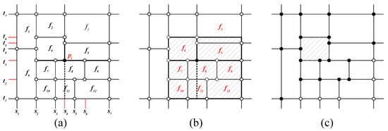 Knot vectors calculation, influence domain, influence points of T-spline surface: (a) Knot vectors calculation of control points using the ray intersection method, (b) the influence domain of a control point filled with shaded area, (c) a set of control points marked by a solid circle for one shaded face.