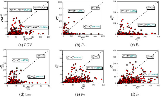 Figure 1, Figure 2 and Figure 3 show the obtained values of the 22 classic IMMS and IMAS by using the acceleration-, velocity-, and displacement-related IMs, respectively. It is found that most of the selected MS ground motions have larger intensities than the corresponding AS ground motions regardless of the IMs adopted, indicating significantly higher hazard caused by MSs compared to ASs. As observed, approximately over 90% (except only 89.32% of PGAMS values is greater than the corresponding PGAAS values, as shown in Figure 1a) of the considered MS ground motions show larger IMs than the corresponding AS ground motions. This result shows the larger damage potential of MSs than the corresponding ASs. Since the IA, Ea and ars have similar definition equations (see Table 1), their percentages corresponding to (Figure 1b), (Figure 1c), and (Figure 1d), respectively, are almost the same. Similar results can be also observed between Ev (Figure 2c) and vrs (Figure 2e) and that between Ed (Figure 3c) and drs (Figure 3e). Moreover, among the considered acceleration, velocity, and displacement IMs, the integral-formed IMs show slightly larger percentage with IMMS > IMAS than the other IMs.