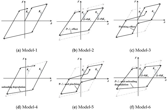 Among the considered models, the basic model, which is numbered as Model-1, is an elastic-plastic-with-hardening model (see Figure 4a). Based on the basic model, three important factors, including the P-Δ effect, pinching effect, and unloading degradation, are partly or totally incorporated in Models 2–8 to reflect more complex nonlinear behaviors of structures under seismic loading. In particular, Models 2–4 represent the bilinear hysteretic models by individually considering the P-Δ effect, pinching effect, and unloading degradation, respectively (see Figure 4b–d). For Models 5–7, two of the above-stated influence factors are accounted for in the hysteretic behavior, as shown in Figure 4e–g, respectively. Besides, Model-8 has the most complex hysteretic behavior since it collectively incorporates the P-Δ effect, pinching effect, and unloading degradation (see Figure 4h). It is noteworthy that the considered Models 2–8 are used for parametric study to examine the effect of hysteretic models of SDOF systems on the obtained results.