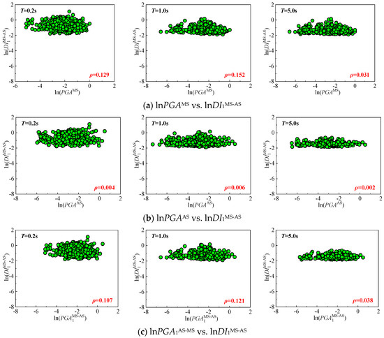 Figure 8 shows the scatters in terms of lnPGAMS vs. lnDI1MS–AS, lnPGAAS vs. lnDI1MS–AS, lnPGA1MS–AS vs. lnDI1MS–AS, and lnPGA2MS–AS vs. lnDI2MS–AS. It is clear that the correlation between the MS (or AS) intensity alone (i.e., PGAMS or PGAAS) and the structural cumulative damage (i.e., DI1MS–AS) is insignificant with the ρ values less than 0.3. Moreover, there is no clear improvement in the correlation between lnPGA1MS–AS and lnDI1MS–AS in which the entire earthquake sequence is regarded as one nominal ground motion. Yet, PGA2MS–AS shows a much stronger interdependence with DI2MS–AS, with correlation coefficients exceeding 0.5. Besides PGA, similar observation can also be obtained from the other IM-related data, which are summarized in Figure 9. As observed, the correlations between lnIM2MS–AS and lnDI2MS–AS for different considered IMs are always much larger than those of the other pairs (e.g., between lnIMMS and lnIM1MS–AS). These results confirm that IM2MS–AS performs much better than the other three types of IMs, i.e., IMM, IMAS, and IM1MS–AS, for the prediction of the damage potential of earthquake sequences.